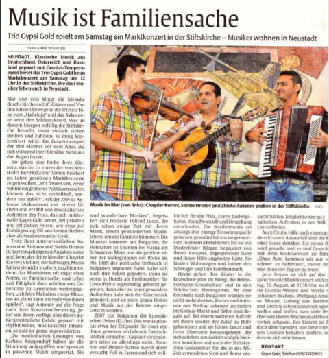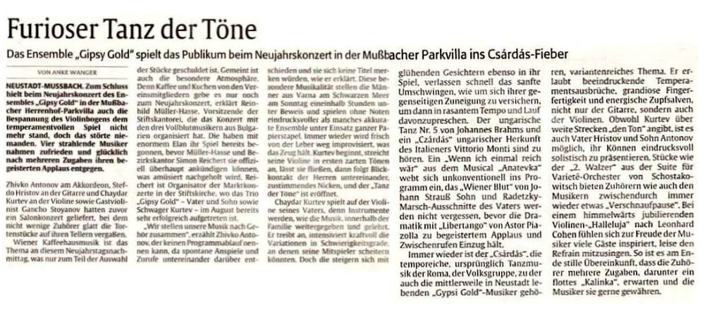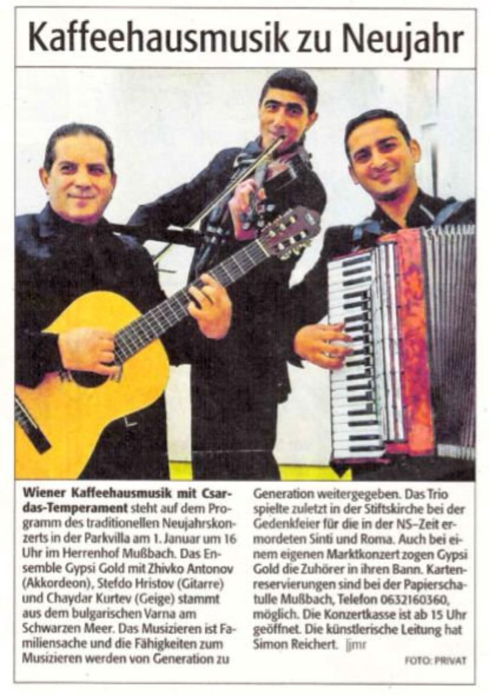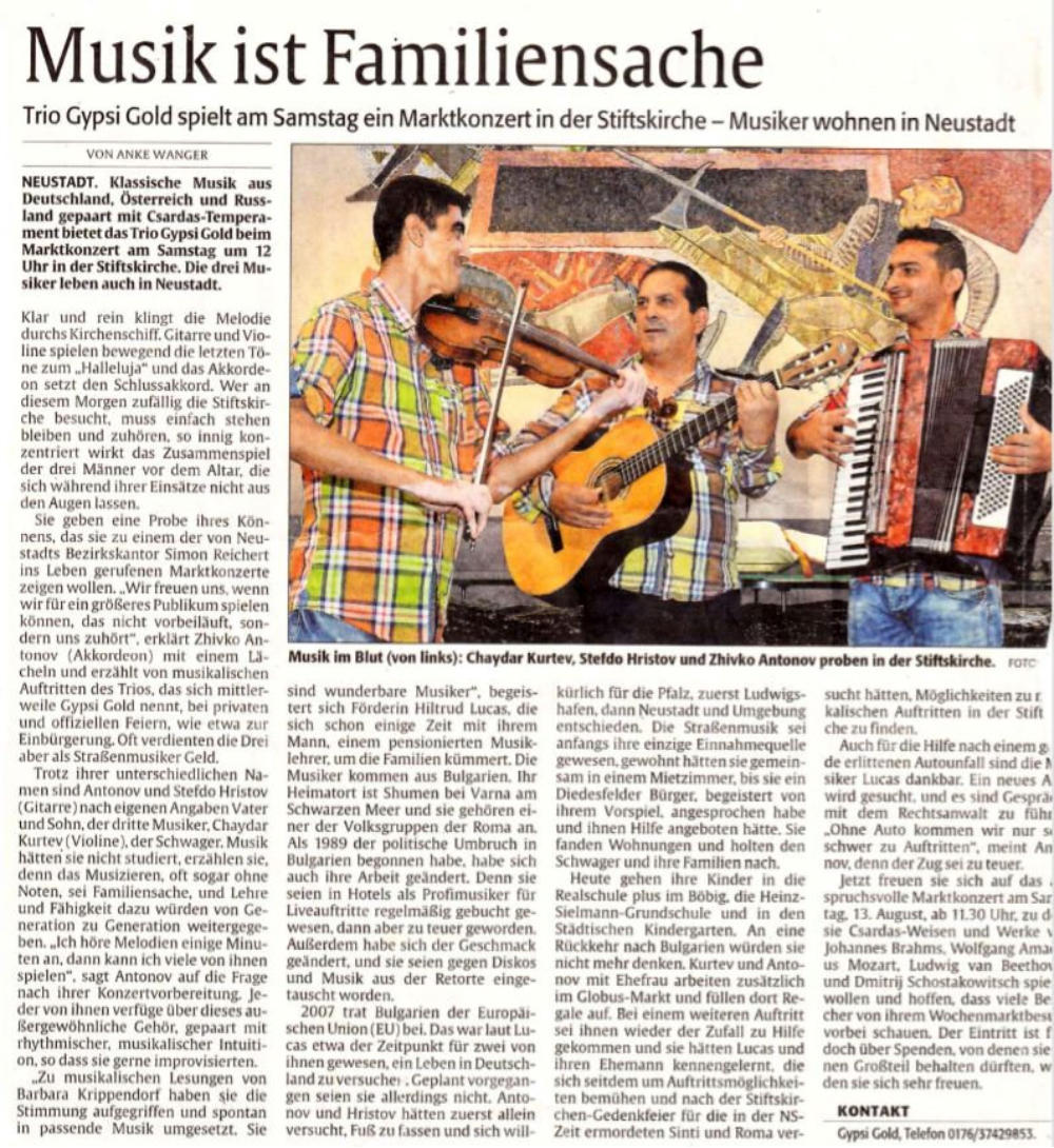Die Lokalpresse “Die Rheinpfalz”berichtet immer wieder über dieAuftritte des Roma-Trios“Gypsy Gold” in Neustadt undUmgebung.Wenn Sie uns buchen oder mehrüber uns wissen möchten, dannrufen Sie uns doch einfach an:0176 / 374 298 53